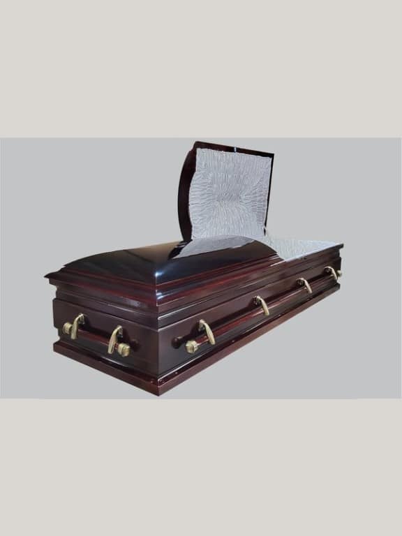 Большой, красивый, двухкрышечный гроб. Выполняет требование морга «полуторный» гроб. Дерево покрыто глянцевым лаком. Постель, подушка и покрывало входят в комплект.