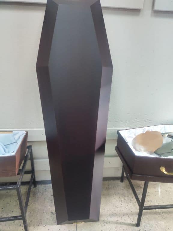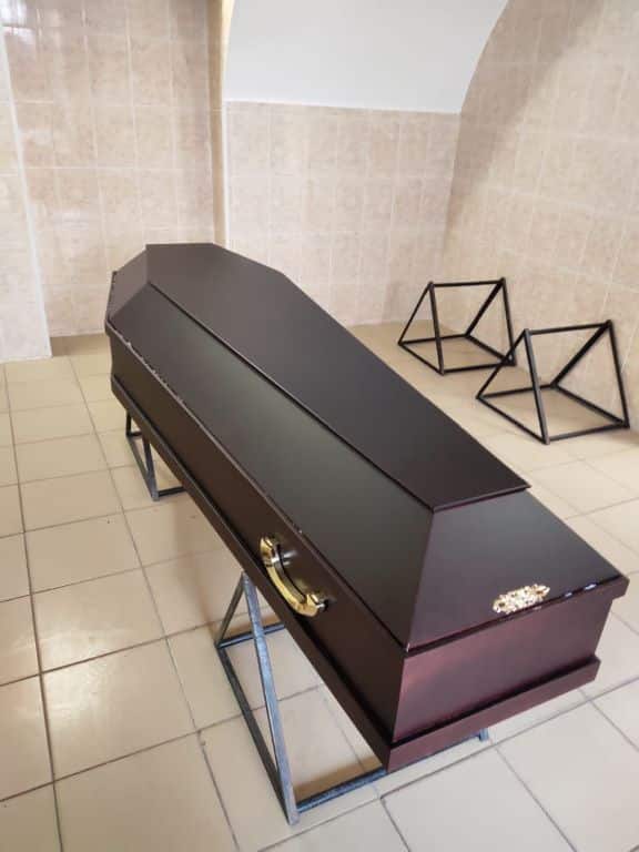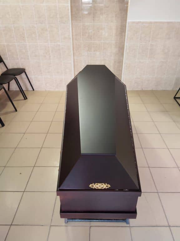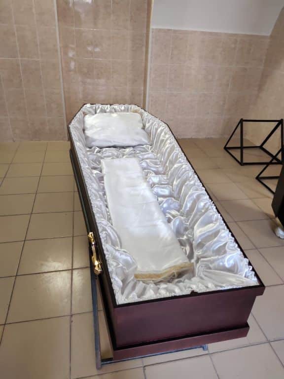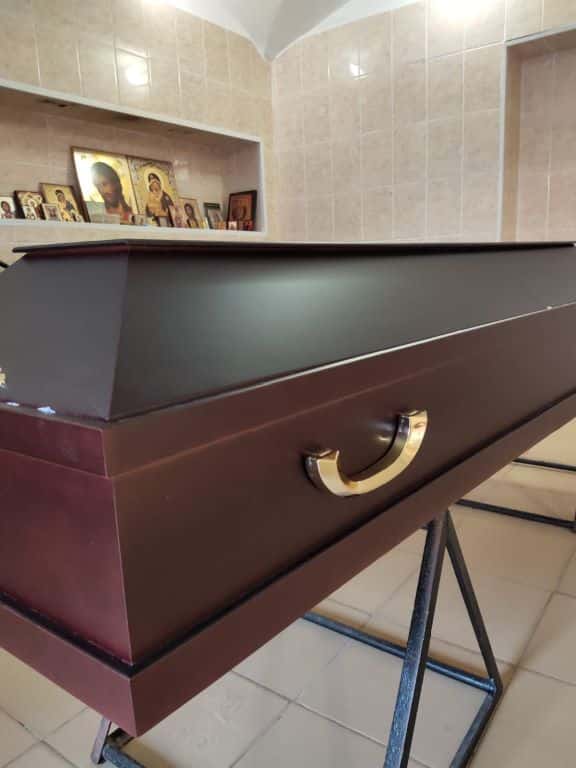 Новинка! Подходит для крематория! Изготовлен полностью из натурального дерева. Тёмная, полуматовая обработка дерева. Атласная обивка. Массивные ручки.