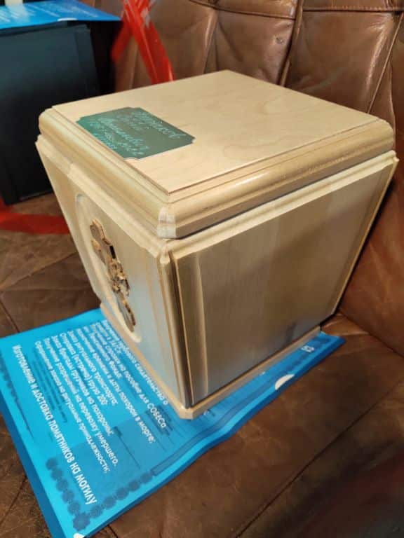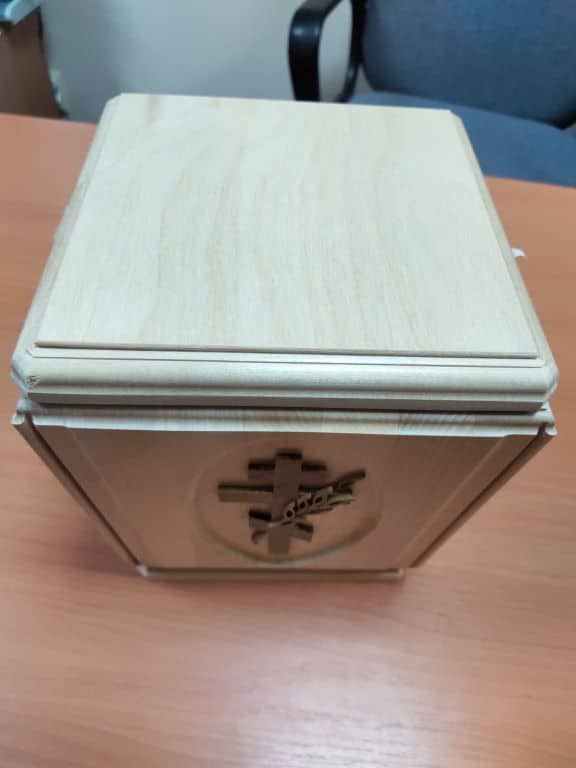 Деревянная урна для праха из массива берёзы, размеры 200-200-247 мм.